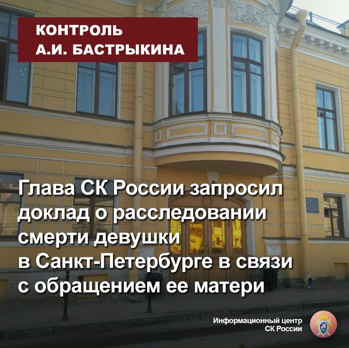 Жительница города Санкт-Петербурга обратилась к Председателю Следственного комитета Российской Федерации Александру Ивановичу Бастрыкину с просьбой взять под личный контроль ход расследования уголовного дела по факту смерти ее дочери. Женщина сообщила, что 31-летняя девушка погибла в июне текущего года. Она считает, что ее дочь выбросили из окна многоквартирного дома.