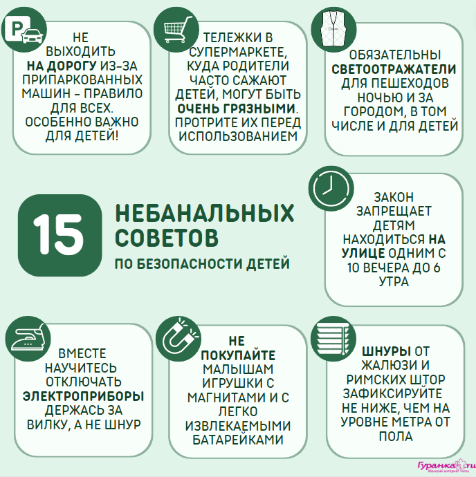 Детей необходимо с раннего детства обучать самым главным правилам безопасности. «Гуранка» предлагает вам 15 советов, которые нужно периодически озвучивать ребенку. Так вы сможете оценить его знания и еще раз повторить важные правила безопасности.