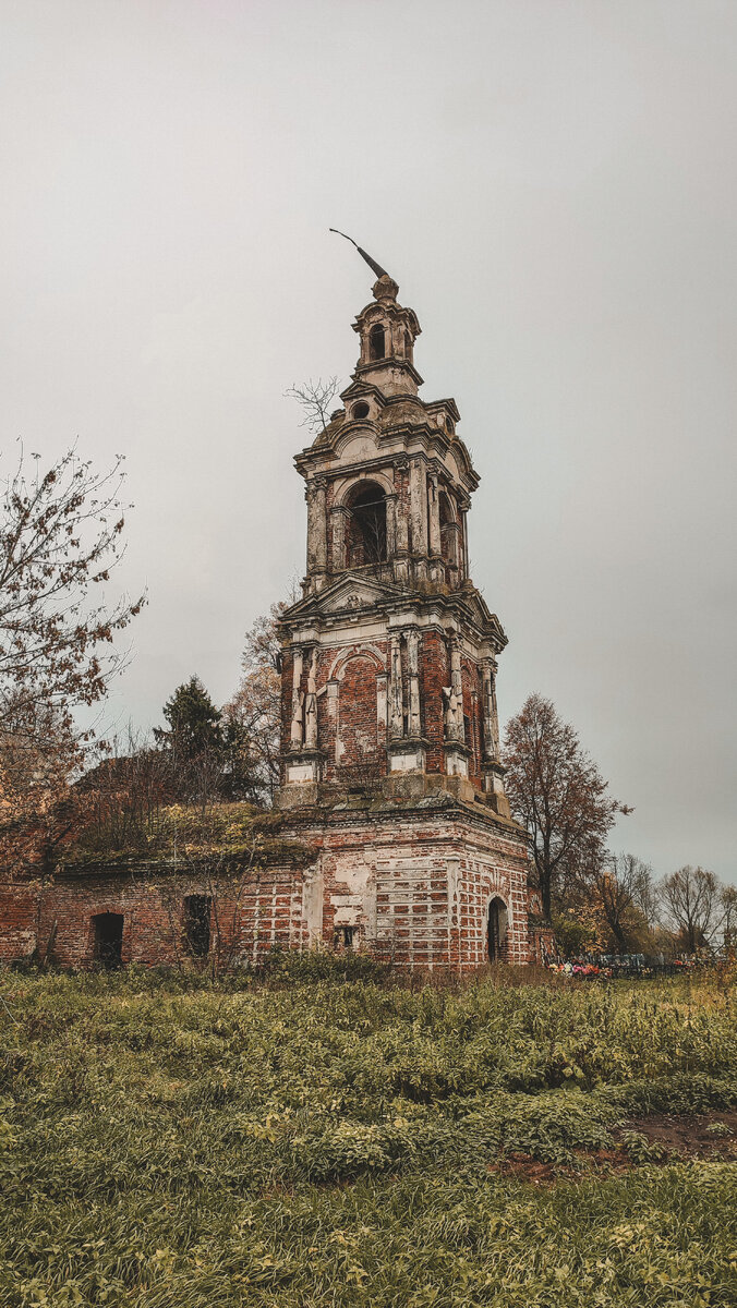 Ее покосившийся шпиль виднелся из далека, крутой поворот и у самой дороги стоит потрясающая церковь. Наверное, она мне так понравилась, потому что чем-то напоминает колокольню в Калязине, куда я обязательно поеду в будущем. Храм Константина и Елены очень старый, 1712 года, но колокольня новее, ее построили уже в 1878 году, что и сделало церковь такой неповторимой. На фотографии видно это примыкание. Большое село сейчас не такое уж и большое, а кроме храма, смотреть больше и нечего. Но, вообще, история у села долгая и много интересного можно почитать, в том числе и на дзене. Я не разбираюсь в архитектуре, и не могу правильно называть детали фасада. Но по-моему здесь и так видно, что работа была огромная и делалась с большой любовью. Как по мне, эта колокольня красивее той, что в рязанском Кремле. Больше линий, больше изгибов, больше деталей. Я в очередной раз удивляюсь, как и что так повлияло на людей одной страны, что сто и более лет назад строили красиво и это даже не в городе, а в д