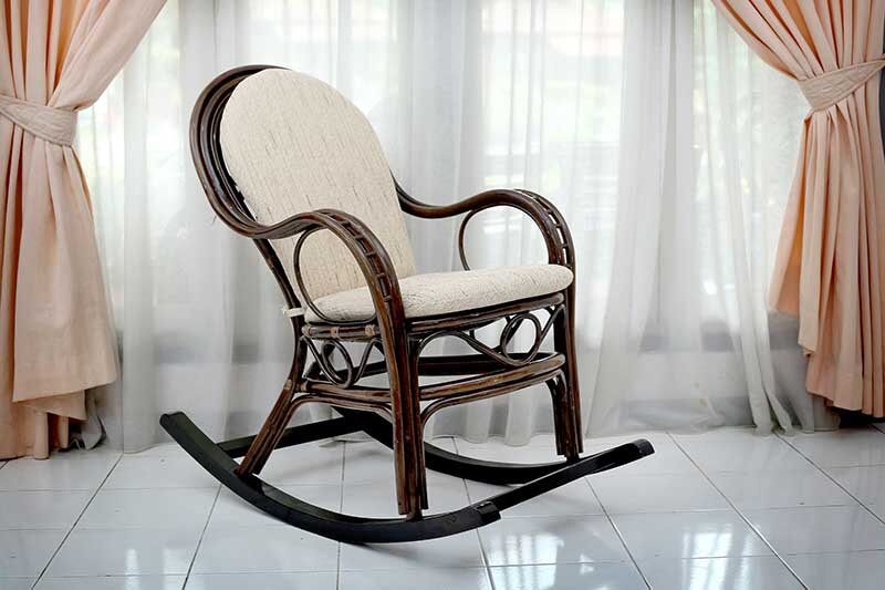 • ротанг. Материал представляет собой специально обработанные и просушенные стебли пальмы. Материал разной толщины и длины может применяться для изготовления различной мебели, спинок и сидений кресел или стульев, создания предметов декора. Используется при оформлении помещений в скандинавском или колониальном стилях, на кресло-качалку из него можно накидать декоративных подушек или завершить его образ пёстрым цветастым пледом. Ротанг экологичен и безопасен для здоровья домашних питомцев или людей. Кроме натурального материала такого типа нередко используются его синтетические аналоги, по внешнему виду почти не отличающиеся от естественного ротанга, но стоящие дешевле в изготовлении;