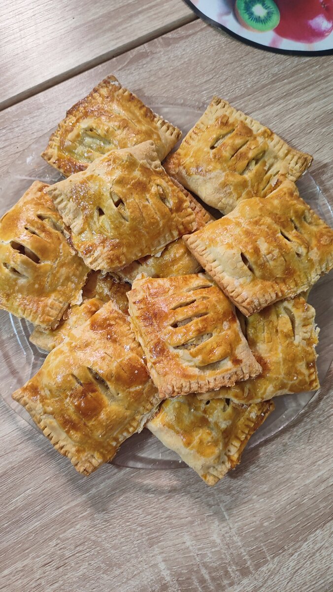 Домашний десерт на раз-два. Быстро, вкусно и без всяких ГМО и химических добавок. Нам понадобится: * 500 гр слоеного дрожжевого или бездрожжевого теста * 3 яблока *3 ст.л. сахара * 1 ст.л. корицы * 1 яйцо * 20 гр муки для раскатки теста * 1 ст.л. сахарной пудры для украшения Яблоки промыть, очистить и нарезать кубиками. В отдельной тарелке посыпать сахаром и корицей. У меня два куска теста, раскатываем каждый по отдельности. Разрезаем на приблизительно равные части и визуально каждый кусочек делим на пополам. На одну половину выкладываем начинку, а на второй делаем разрезы. Кроя скрепляю вилкой. Выкладываю на противень, слегка присыпленный мукой и смазываю яйцом. Яйцо вилкой необходимо слегка взболтать. Отправляю слойки с яблоками в разогретую духовку до 180° на 20-25 мин. Готовые слойки, когда остынут можно присыпать сахарной пудрой. Но у меня она закончилась ☺️ Приятного чаепития! #кчаю #десерт выпечка