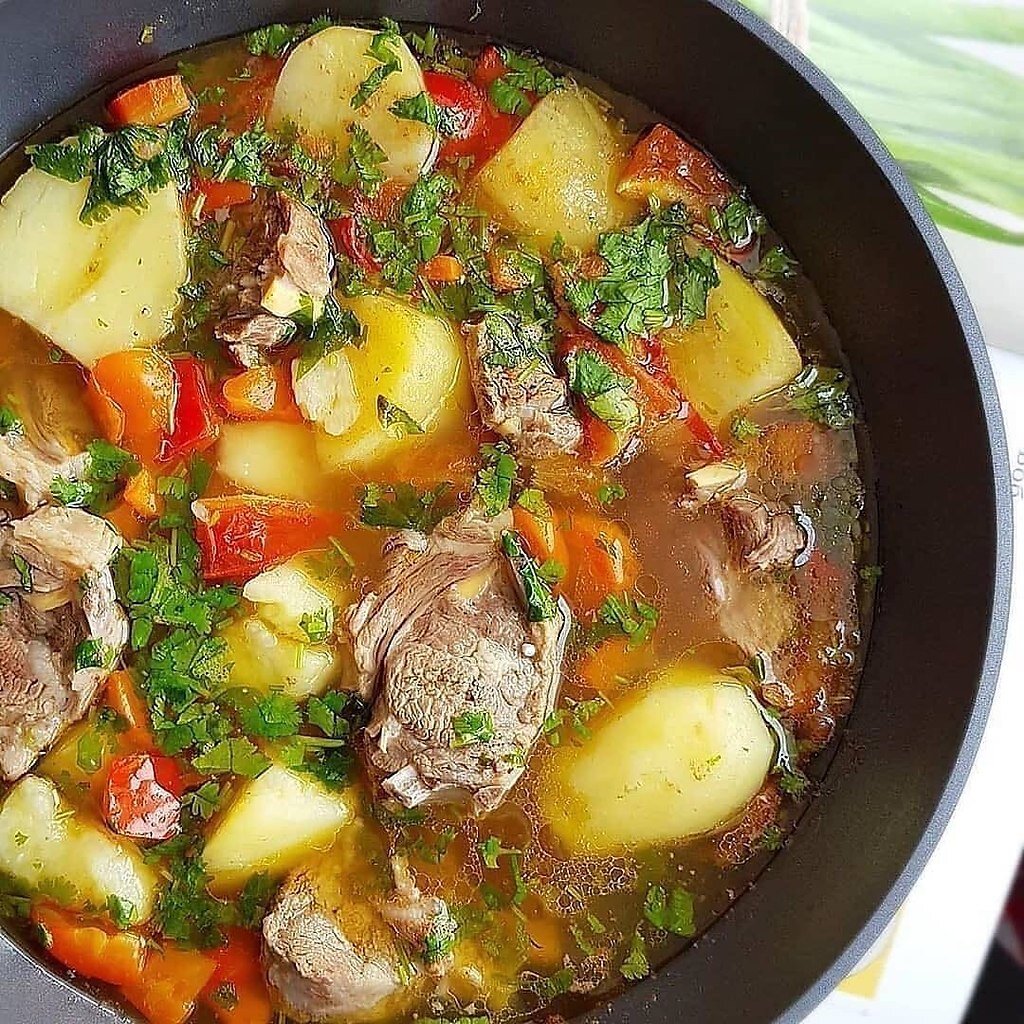 Суп - самое главное блюдо на обед. Придает сил и здоровья, хорошую работу пищеварению. Перейдем к приготовлению самого вкусного супчика дня. Для начала нужно взять рёбрышки - восемьсот грамм. Нарезать их вдоль косточек и обжарить на сковороде, с добавлением растительного масла, на сильном огне до румяности. Далее лук - две штуки, нарезать тонкими полукольцами, высыпать к рёбрышкам и жарить на среднем огне две минуты. Потом взять морковь - две штуки, нарезать кружочками, можно наискосок. Добавить к рёбрышкам и луку, посыпать солью - одна чайная ложка, чёрный перец - одна третья чайной ложки, паприка - чайная ложка. Все перемешать и жарить три минуты. Понадобится сладкий болгарский перец, желательно красный - одна штука. Помыть и вытащить внутренности, разрезать пополам и нашинковать соломкой. Далее взять помидоры - 2 штуки. Разделить пополам и нарезать дольками. Самое главное картофель - один килограмм. Начистить и нарезать крупными кубиками. Готовую смесь из сковороды, поместить в кас