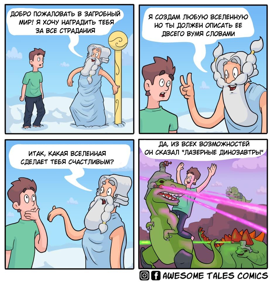 Комиксы «Awesome Tales Comics» шутят насчет загробной жизни, рая и ада в христианской трактовке. В серии много черного юмора и шуток на другие, не менее чувствительные для многих темы. Но если не относится к комиксам с излишней серьезностью, то вполне можно посмеяться, потому что многие шутки действительно смешные.