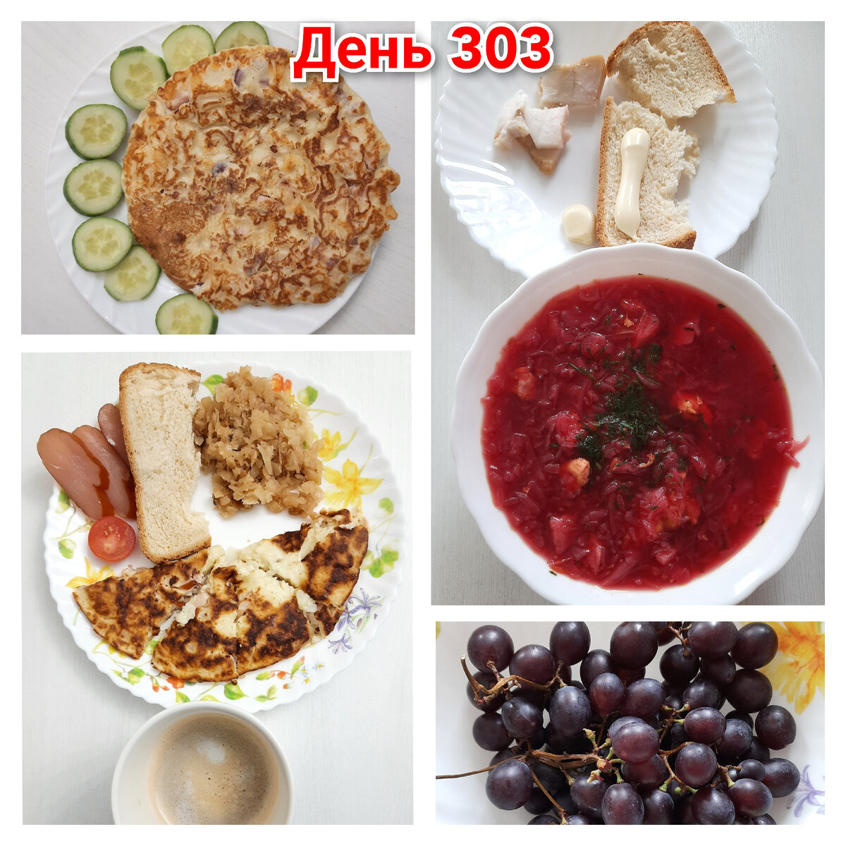 #Завтрак – кофе с молоком фермерским и 1 ч.л. сахара. Кусочек моего домашнего хлеба. Тушеная капуста. Карпаччо (магазинское с адекватным составом). Половинка черри от моего томата в горшке на подоконнике. Сырная лепешка с карпаччо (половинка, вторая у мужа). 1 яйцо+100 мл кефира+50г муки+соль, мешаем. Тру 50г сыра, режу лук, добавляю замороженный кубиком карпаччо 30г (магазинский с хорошим составом). Все вместе смешиваю. На сковороду без масла, с каждой стороны до румяной корочки. #Обед – белковый борщ (рецепт в дне 302), мой хлеб их хлебопечки, майонез 5г, чеснок, копченое сало. А еще я похрумкала кусочек капусты. Вы так делаете? Это же очень вкусно! Если капуста сочная конечно. Иногда не нужно думать, что приготовить из этого овоща, а просто стоит съесть его сырым. #Десерт – виноград с огорода, который выращивают родственники. #Ужин – огурец и снова сырная лепешка, как на завтрак, но ее готовила свежую, полностью сначала. Вот так иногда бывает, что повторяется блюдо))) #домашнеемен