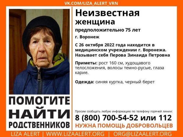 В Воронеже 26 октября в больницу попала неизвестная женщина. Предположительно ей 75 лет, а называет она себя Перова Зинаида Петровна. Добровольцы отряда «Лиза Алерт» объявили поиски родственников найденной пенсионерки. Женщина ростом 160 сантиметров, худощавого телосложения, темно-русые волосы и карие глаза. На ней синяя куртка и черный берет. Волонтеры просят воронежцев помочь бабушке вернуться домой. Если вы обладаете какой-либо информацией о найденной, просьба позвонить по номеру телефона горячей линии отряда 88007005452 (бесплатно по РФ) или 112.