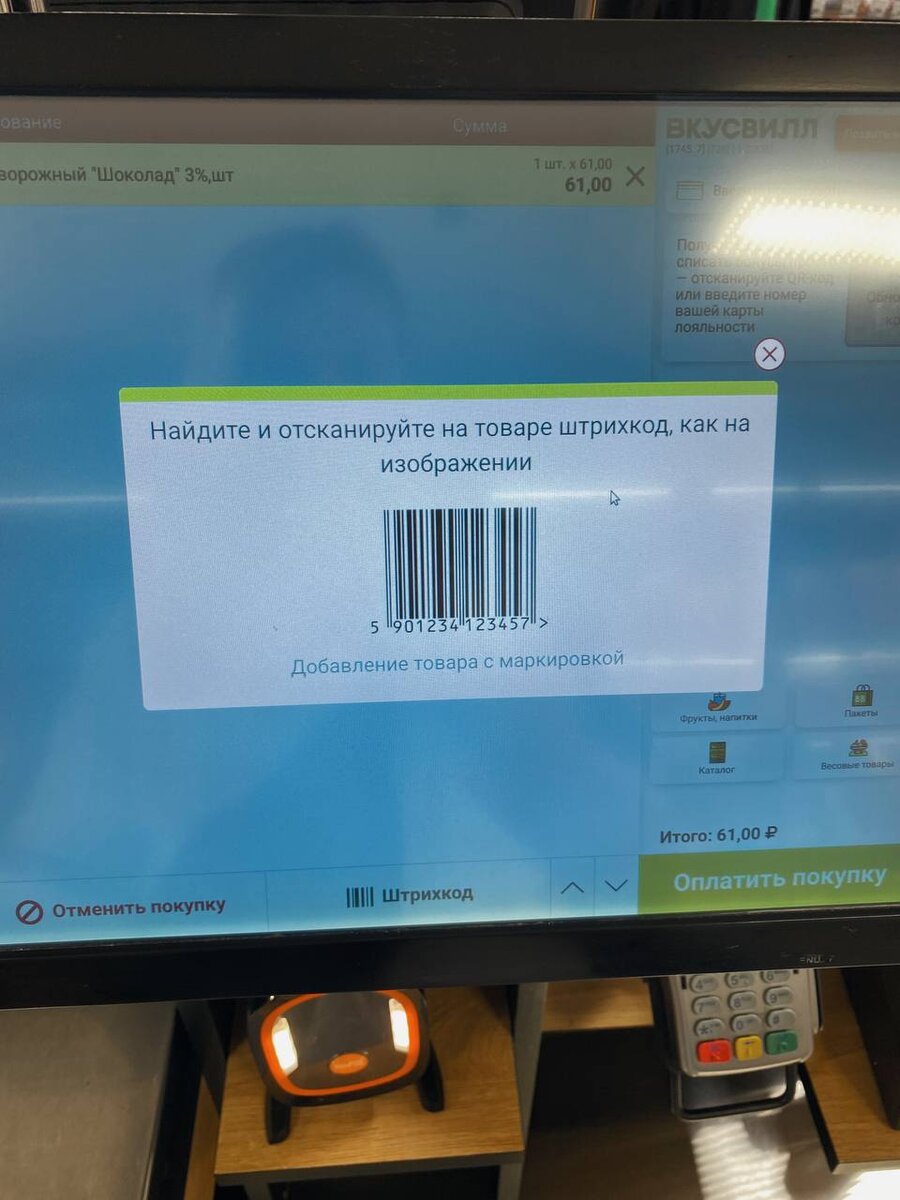 С 1 сентября 2022 года для покупки молочной продукции стало необходимо сканировать на кассе дополнительные коды. Что это за коды и как их сканировать - читайте в материале. Для чего необходимы коды маркировки Система маркировки “Честный знак” разработана для гарантии потребителям подлинности и заявленного качества приобретаемой продукции. Отсканировав код, вы можете быть уверены, что перед вами не подделка. Зачем сканировать коды на кассе Это новый этап маркировки молочной продукции. Такое сканирование - завершение огромного пути товара, который прослеживался от изготовления до продажи конечному потребителю. Как отсканировать код маркировки на кассе самообслуживания Сканируйте штрих-код товара Находите DataMatrix код на товаре Сканируйте DataMatrix код (его можно отсканировать и до штрих-кода) Этапы маркировки товара: 1) Производитель наносит цифровой DataMatrix код на товар. Уполномоченный государством оператор Центр развития перспективных технологий присваивает каждому товару уникаль
