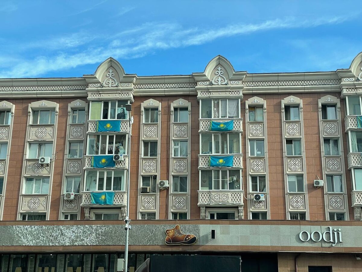 Они теперь прилеплены почти к каждому балкону. Со стороны дворов балконы тоже есть, но там вешать флаги не стали. Жители этих домов признаются, что это не их рук дело, флаги прикрепили сотрудники акимата. Впрочем, жильцы не против. Пару лет назад за такое можно было схлопотать штраф, но сегодня (особенно в преддверии выборов) такие приступы патриотизма не запрещены.