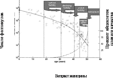 Рис. 1 Возраст женщины и овариальный резерв: уменьшение количества производимых яйцеклеток.
