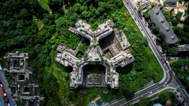 С высоты птичьего полета, больница напоминает знак ядерной угрозы. Здание строили 5 лет, но так и не завершили строительство из-за приостановления финансирования. Больница полюбилась сектантам и сатанистам, которые начали проводить в ней обряды. В начале 1990-ых в больнице нашли убитую девушку, после чего охрану усилили. И сейчас попасть в Ховринскую довольно сложно.