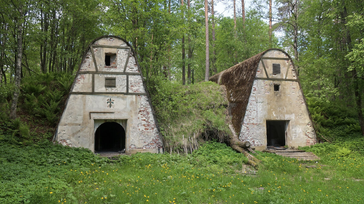 Очень необычное местечко в Ленинградской области, совсем недалеко от Петербурга. До сих пор стоят красавцы, как будто время их не берет. Визуально столь необычные строения, за давностью лет совсем заросшие лесом напоминают скорее жилища хоббитов из произведений Толкина. Вылитый Шир! Что именно в них хранилось, на сегодняшний день доподлинно неизвестно.