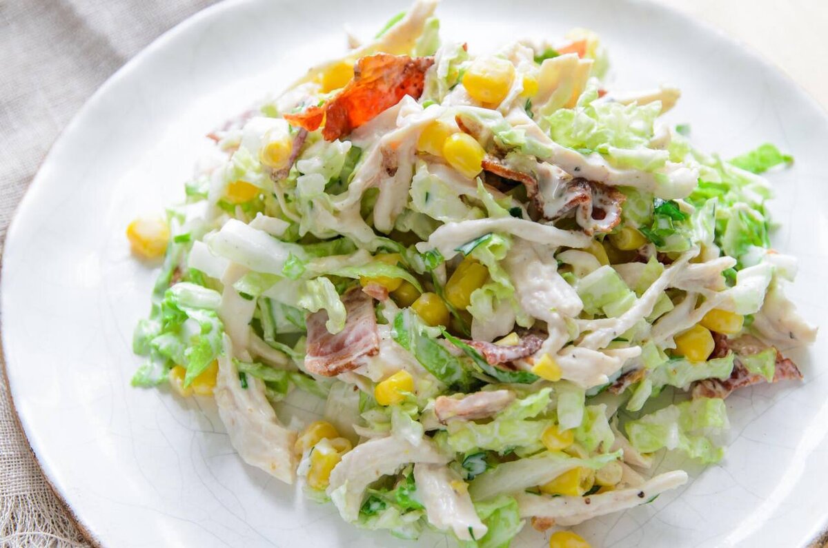Салат из пекинской капусты 📖 Ингредиенты: - Пекинская капуста — 400 г. - Ветчина — 200 г. - Болгарский перец — 1 шт. - Консервированная кукуруза — 100 г. - Майонез — 3 ст. л. - Соль, перец — по вкусу 🧑🏻🍳 Приготовление: 1. Пекинскую капусту разделите на четыре продольные части и мелко нарежьте. 2. Ветчину нарежьте соломкой небольшой толщины. 3. Перец помойте, удалите семена и тоже нарежьте соломкой. 4. С консервированной кукурузы слейте лишнюю воду. Смешайте ветчину, перец, пекинскую капусту и кукурузу. 5. Немного посолите и добавьте черный перец по вкусу. Заправьте по вкусу.