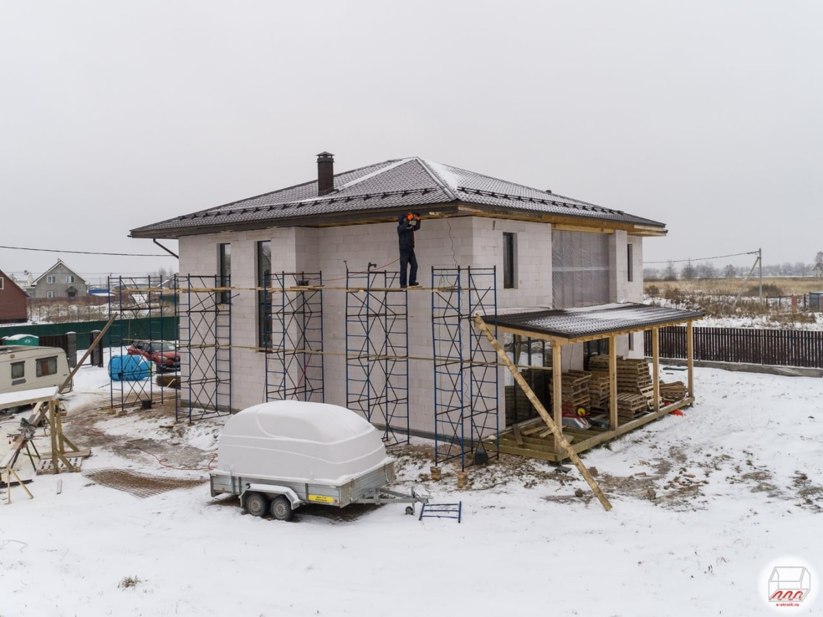 Конец осени - все еще благоприятный период для строительства. Отсутствие заморозков в продолжение суток (до -5) не создает необходимости использования морозостойких клеевых смесей и прогревания паллетов с блоками.
