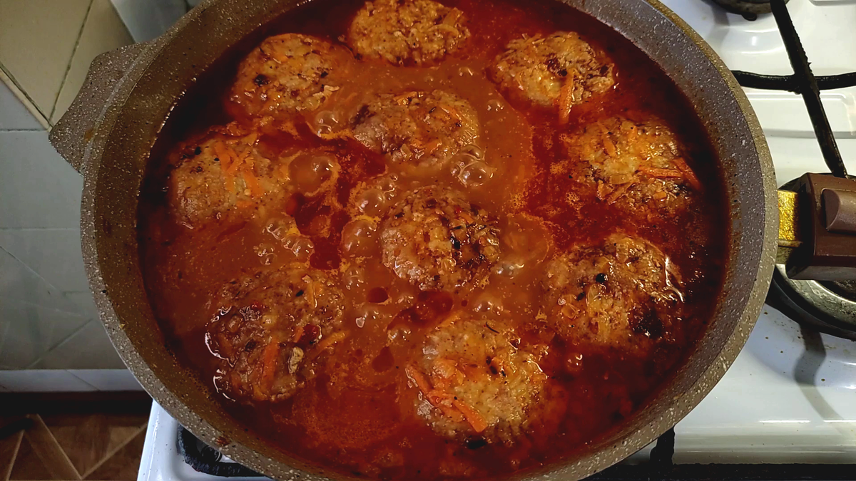 Хочу поделится с Вами простым рецептом очень вкусных домашних тефтелей на сковороде. Которые сначала обжариваются, а потом тушатся в подливке. Это очень вкусный сытный ужин для всей семьи, который понравится всем и готовится очень просто и быстро. Нам понадобится: подливка: Берем фарш, добавляем одну измельченную в блендере луковицу, одно яйцо, отваренный до полуготовности рис, солим, перчим по вкусу и хорошо перемешиваем. Смачиваем руки водой и формируем сразу все тефтели. Затем обваливаем каждую тефтелину в муке и обжариваем на сковороде на растительном масле. Обжариваем с каждой стороны на среднем огне по 3-4 минуты. Пока обжариваются тефтели, мелко нарезаем одну луковицу и натираем на крупной терке одну большую морковку. Тефтели обжарились, выкладываем пока на тарелку и тут же на этой сковороде обжариваем лук до слегка золотистого цвета. Добавляем морковь и обжариваем еще 4-5 минут. Затем добавляем 2 столовые ложки томатной пасты, одну чайную ложку прованских трав, пол чайной ложк