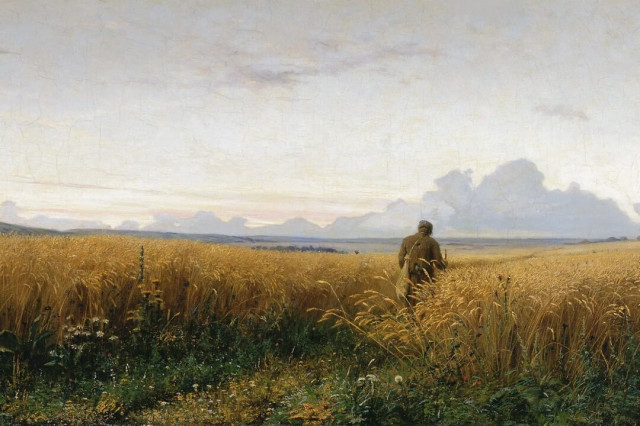 И оказался в просторном вестибюле, прямо перед огромной картиной в золоченой аляпистой раме. Во всю ширину картины разлилась золотыми волнами колосящаяся рожь. На переднем плане картины стояли два хлебороба, один из которых простертою рукою указывал
