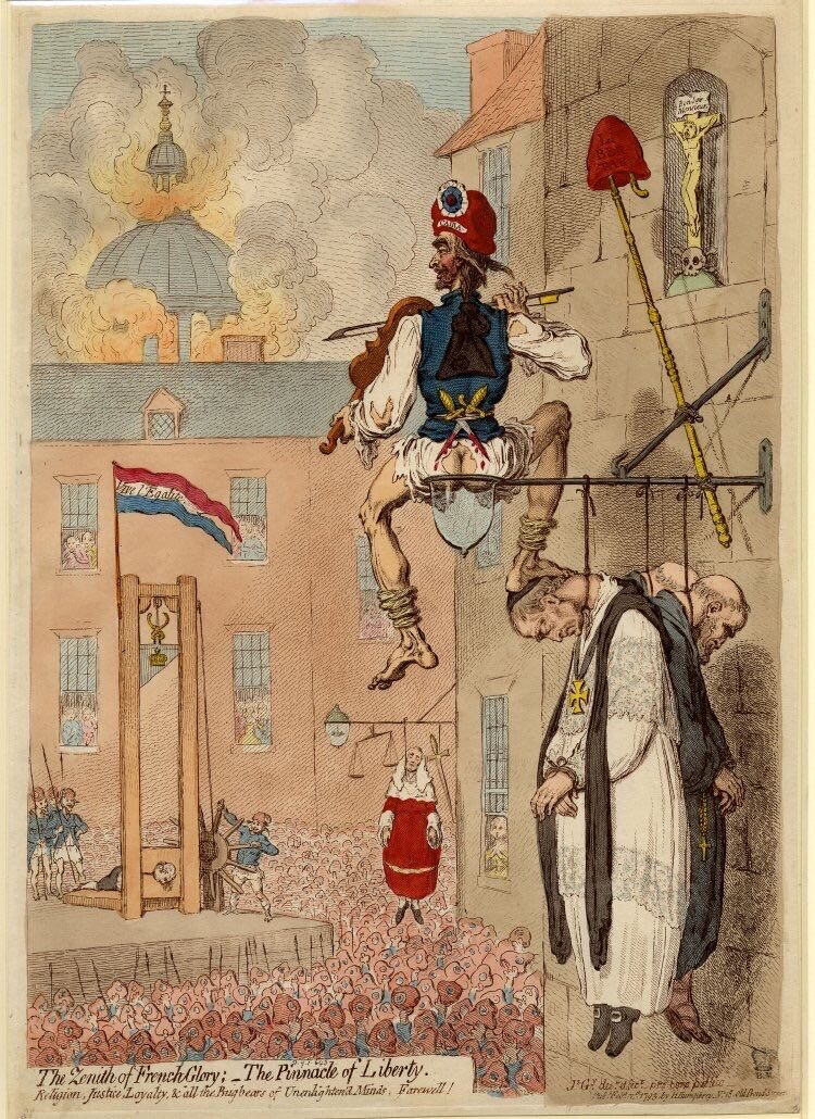 1) Английская сатира на Великую Французскую революцию, 1793 год. Французский народ - санкюлот (sans-culottes - без кюлот/штанов) радостно взирает на события. Епископский жезл венчает символ революции - фригийский колпак.