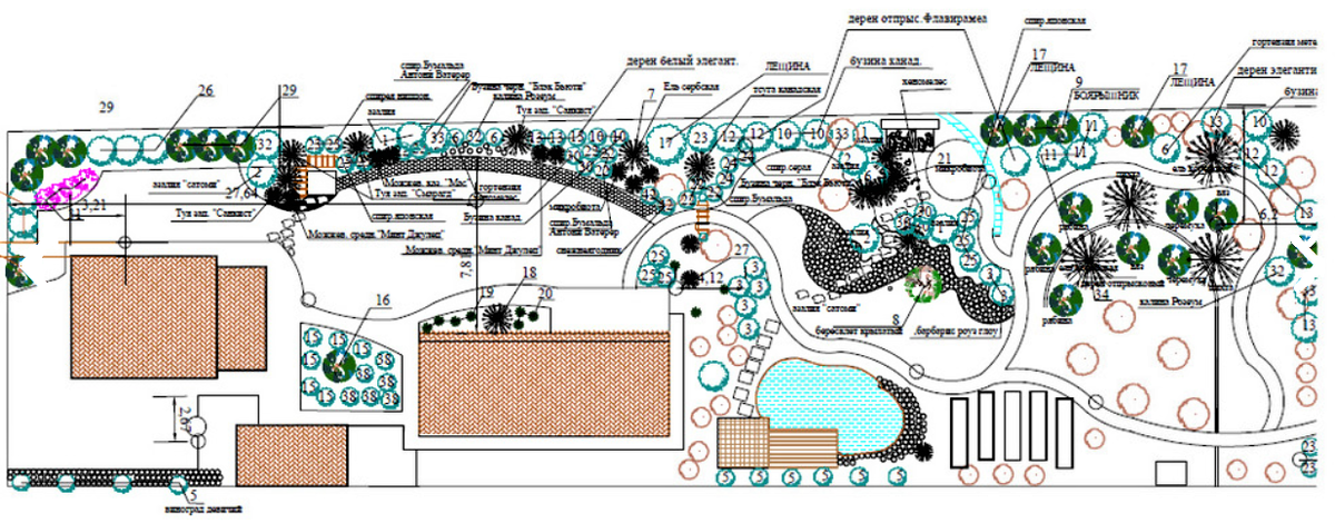 Наш герой приобрел этот участок около 7 лет назад. Особенность участка была в том, что он был вытянутый и ровный. Изначально, здесь не было ничего, поэтому первом делом хозяин начал строить дом, баню и беседку. После завершения строительства, он решил облагородить участок и обратился в студию ландшафтного дизайна. Проект Вся структура сада строится вокруг дорожки, которая тянется от самого начала участка (от калитки справа на плане) и до самого дома (самая левая постройка на плане). Весь сад выполнен в пейзажном стиле. Основная извилистая дорожка выложена из плитняка. В начале участка, с правой стороны от тропинки, расположился вересковый сад, а с левой стороны от тропинки появился декоративный огород, который является прекрасным дополнением к общему виду сада. В зоне декоративного огорода выложили деревянный настил. Под ним расположился геотекстиль и гравий для дренажа. Грядки немного приподняли от земли, для удобства в уходе за огородом. Бортики грядок сделаны из сосновой доски высот