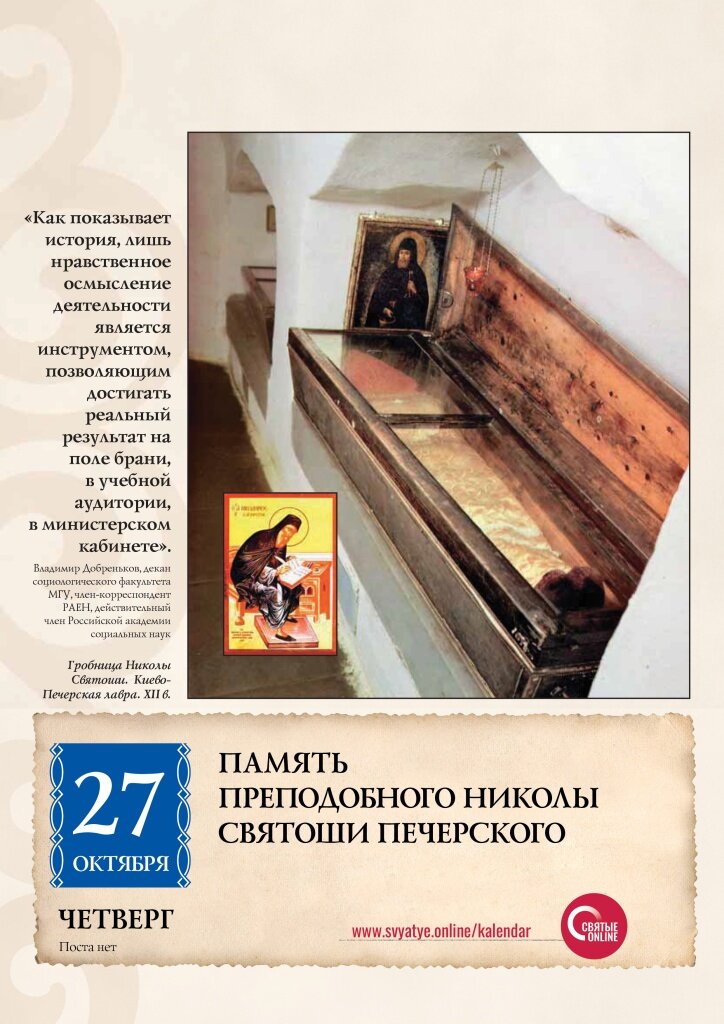 КАК ПОКАЗЫВАЕТ ИСТОРИЯ, ЛИШЬ НРАВСТВЕННОЕ ОСМЫСЛЕНИЕ ДЕЯТЕЛЬНОСТИ ЯВЛЯЕТСЯ ИНСТРУМЕНТОМ, ПОЗВОЛЯЮЩИМ ДОСТИГАТЬ РЕАЛЬНЫЙ РЕЗУЛЬТАТ НА ПОЛЕ БРАНИ, В УЧЕБНОЙ АУДИТОРИИ, В МИНИСТЕРСКОМ КАБИНЕТЕ. Владимир Добреньков, декан социологического факультета МГУ, член-корреспондент РАЕН, действительный член Российской академии социальных наук Преподобный Никола Святоша Печерский Преподобный Никола Святоша (Святослав), князь Черниговский, Печерский чудотворец, был правнуком великого князя Ярослава Мудрого и сыном князя Давида Святославича Черниговского. В некоторых источниках отец преподобного именуется святым. До пострига Никола Святоша был Луцким князем, имел жену и детей. 17 февраля (1 марта по новому стилю) 1106 года князь, оставив семейство, принял постриг в Киево-Печерской обители. Здесь Николай с великим смирением проходил послушания: три года работал в поварне, для которой рубил дрова и носил воду, следующие три года был привратником в монастыре. Около своей келии святой разбил сад. На свои