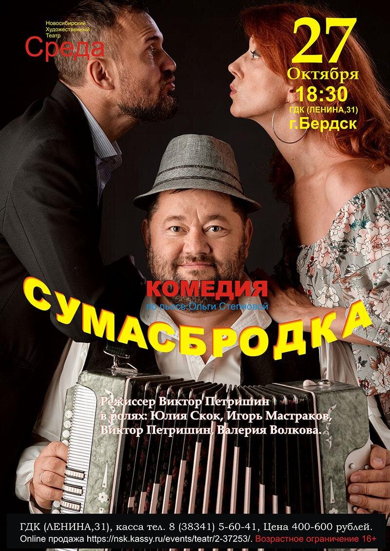 В четверг, 27 октября в 18:30 в большом зале Городского дома культуры состоится комедия «Сумасбродка». Если ты начинающий коллектор, подумай, не останешься ли ты должен сам себе, связавшись с очаровательной сумасбродной должницей. Автор пьесы: Ольга Степнова. (Автор сценариев российских художественных фильмов и сериалов) Режиссер: Виктор Петришин. (Лауреат российских и международных конкурсов) В ролях: Игорь Мастраков, Галина Мыжевских, Виктор Петришин, Валерия Волкова. Комедия «Сумасбродка», Новосибирского художественного театра «Среда», г. Новосибирск (16+) Билеты можно приобрести в кассе ГДК (ул. Ленина, 31). Цена билета – 400-600 руб. Телефоны 560-41 (касса), 300-48. Сайт: http://гдкбердск.рф Вконтакте: https://vk.com/gdkberdsk 16+ Источник: сайт Бердск-Онлайн