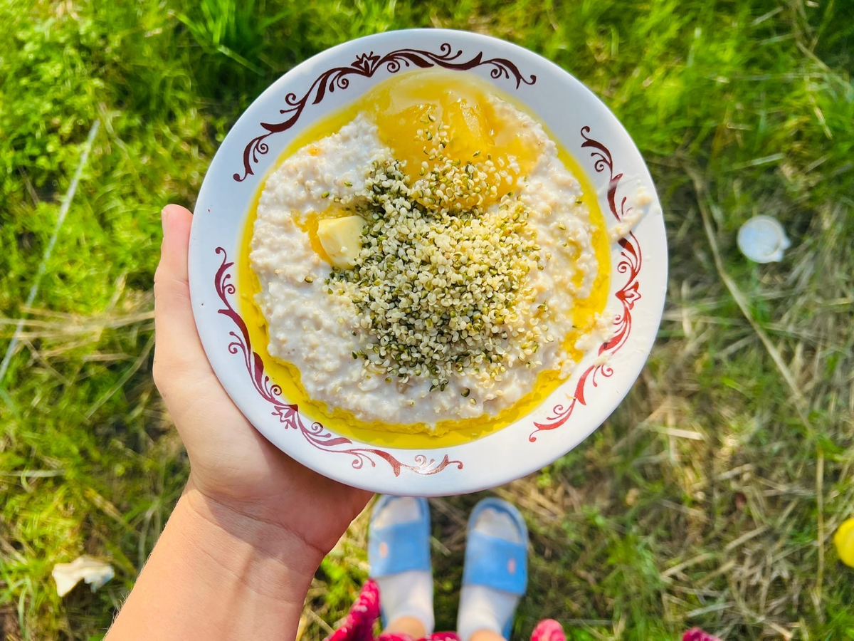 Завтрака у нас нет, обычно выпиваем или какие-то настои или масло. Из покушать - фрукты, а может ничего. Но иногда готовлю любимую сейчас кашу - из толчёного овса с чищенным конопляным семечком, домашним сливочным маслом и мёдом. Иногда немного сушёных степных абрикос или изюма, тоже добавляю.