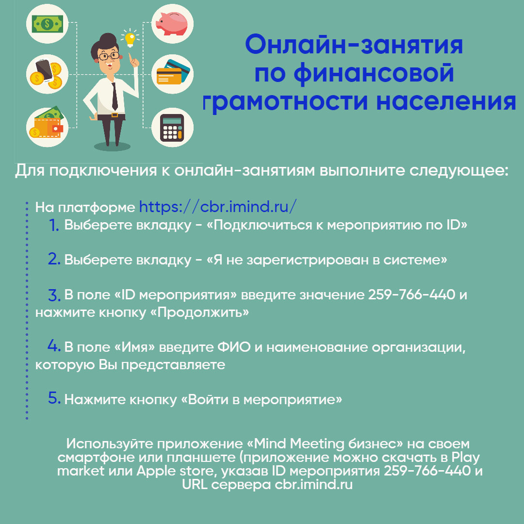 Просмотр онлайн-занятий будет доступен видеоконференцсвязи iMind в сети Интернет: https://cbr.imind.ru/ , ID мероприятия 259-766-440. Подключение возможно, как со стационарного компьютера или ноутбука, так и с использованием смартфона. Формат онлайн-занятий предполагает подключение участников как группами, так и индивидуально (самостоятельно каждым участником).