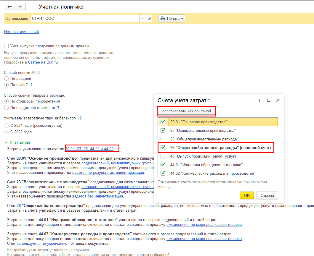 Для автоматического заполнения счета затрат (того, который чаще используется) в документах Расход материалов, Поступление (услуг) надо сделать настройку в учетной политике. Выбрать счет и указать его Использовать как основной. Это не влияет ни на какие-то настройки учетной политики, ни на алгоритм закрытия счетов затрат, только на автоматическое заполнение документов. Для документов производства (Выпуск продукции (отчет производства) эта настройка не срабатывает (там автоматически счет 20.01). При необходимости всегда можно изменить счет затрат вручную. Так же надо заполнить справочник Статьи затрат и справочник Прочие доходы и расходы. Статьи затрат. Можно выбрать настройки для конкретных документов (но там не все виды документов доступны для выбора), а можно - как Основная статья затрат. Аналогичная настройка для справочника Прочие доходы и расходы. Так же доступна более подробная настройка по конкретным документам или как основная. Например, у нас поступление услуг от контрагента