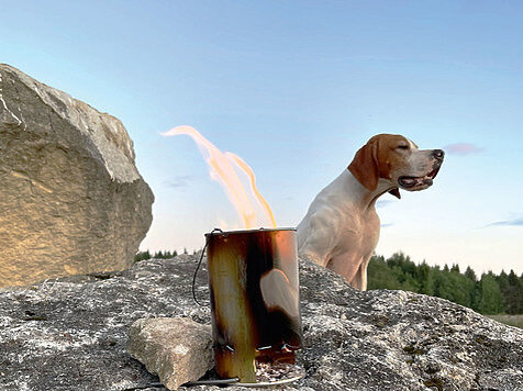 Между поленцами «финской свечи» можно вставить сухие прутики, что усилит тягу, так как пламя по ним быстро побежит вверх. Огонь в основной части печки-щепочницы разгорается довольно быстро, особенно если помогать ему, энергично помахивая туристической сидушкой из «пенки» или большим куском коры дерева, шапкой.