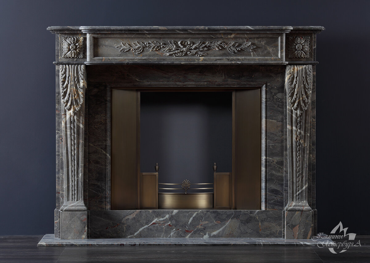 Людовик XVI с лавровой ветвью. Наша коллекция насчитывает немалое количество каминов в стиле Людовика XVI. Среди них - камины, которые можно увидеть в Лувре и Фонтенбло. Когда-то мы задались целью спроектировать новый камин в этой стилистике. Он должен был отвечать запросам рынка. Камин стал меньше по размеру, у него точно такие же кронштейны, но передняя панель декорирована несколько проще, что отражается на стоимости. Камин получился востребованным. Но нам захотелось сделать его более нарядным, и мы изготовили его из мрамора Саранколин. Настоящий французский мрамор, использовавшийся при строительстве Версальского дворца, прекрасно соединился с этой моделью камина. Размер камина: 1500 x h1200 x 370