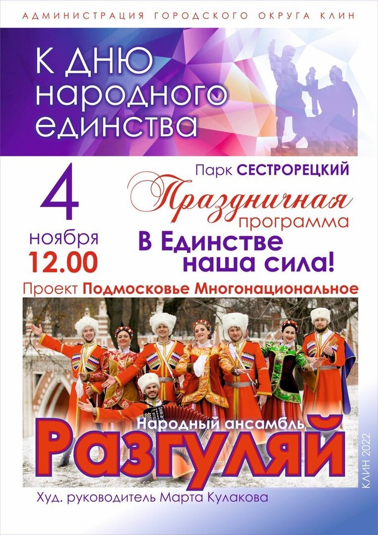 Г.о. Клин 4 ноября вместе со всей Россией будет праздновать День народного единства. В Сестрорецком парке гостей ждет праздничная программа «Подмосковье многонациональное». С 12:00 на сцене амфитеатра будет выступать Народный ансамбль «Разгуляй» из Москвы. Артисты споют народные и казачьи песни, а также станцуют. День народного единства появился в России в 2005 году. 4 ноября вспоминают победу народного ополчения, которое во главе с Кузьмой Мининым и Дмитрием Пожарским изгнало из Москвы польских интервентов.