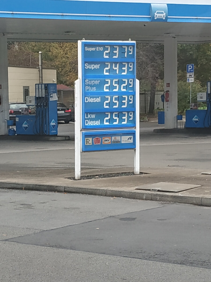 Когда въехали в Германию, уже нужно было заправить машину. Вот тамошние цены на топливо.