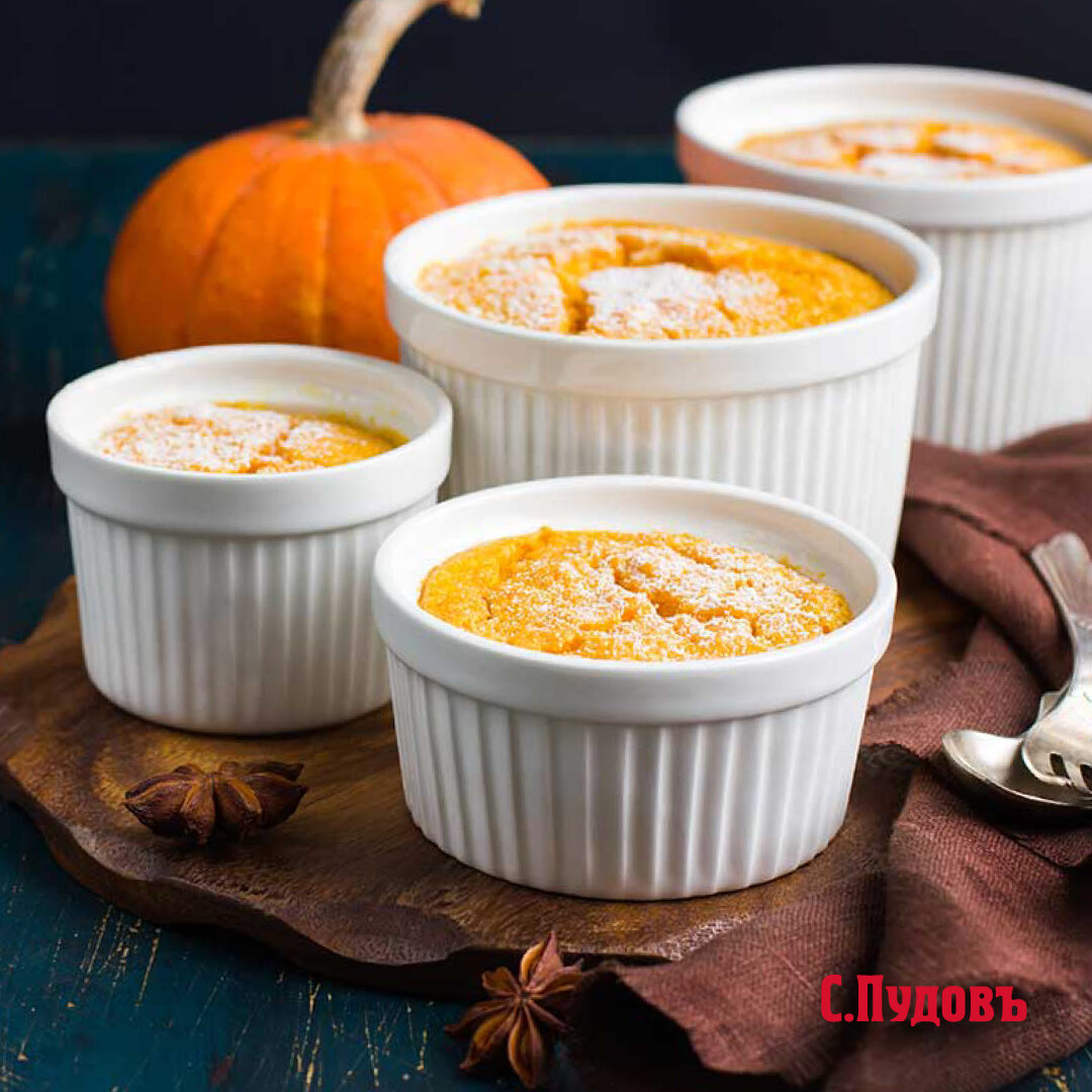 Осенью особенно востребованы уютные десерты, если их так можно назвать. Сочетающие нежность, согревающий аромат специй и полезные сезонные овощи. Суфле из тыквы как раз такое. Рецепт не предполагает сложных ингредиентов и долгого приготовления. Уверены, вы с легкостью приготовите это суфле, и оно понравится всем членам семьи. Подавайте с любовью! Ингредиенты: Крахмал картофельный С.Пудовъ - 2 ч. л. Специи - около 2 ч. л. (молотые гвоздика, имбирь, душистый перец, мускатный орех) Экстракт ванили С.Пудовъ - 1 и 1/2 ч. л. Корица молотая С.Пудовъ - 1/2 ч. л. Натуральная пищевая морская соль мелкая Marbelle - щепотка Тыква - 1 стакан пюре (250 мл, консервированное или приготовленное в домашних условиях) Яичный белок - 6 шт. Сахарная пудра С.Пудовъ - для украшения Масло сливочное размягченное - 15 г Сахар - 2/3 стакана Молоко - 1/2 стакана (125 мл) Приготовление: 1. Разогрейте духовку до 190°C. Смажьте креманки для суфле или круглую форму для выпечки маслом, присыпьте 2 столовыми ложками сах