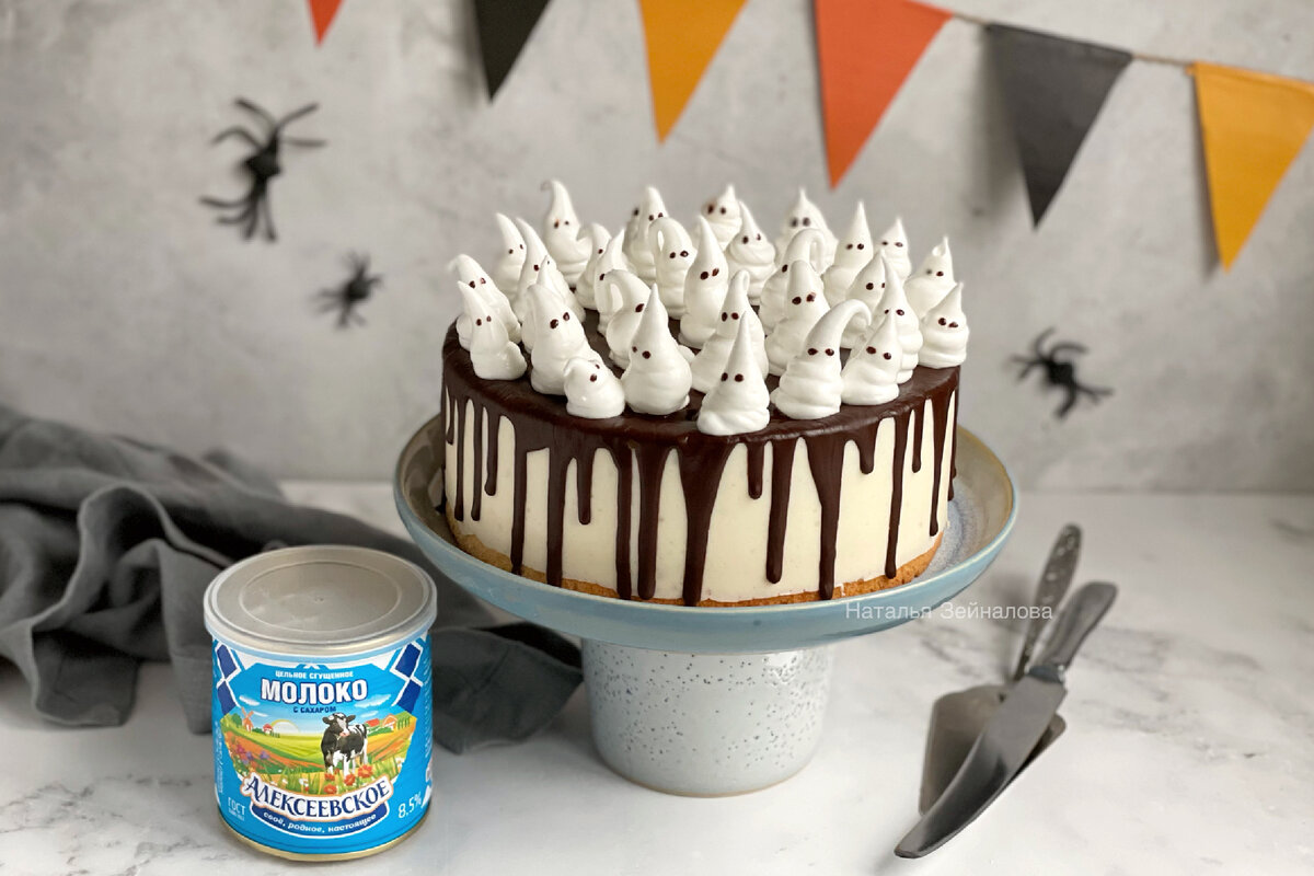 Отрезаем уголок, и лучше сначала потренироваться, отсадите несколько приведений на другой поверхности, затем украсьте торт. Такой крем не твердеет, остаётся мягким, но форму не теряет. Глазки наносим шоколадной глазурью, с помощью зубочистки.