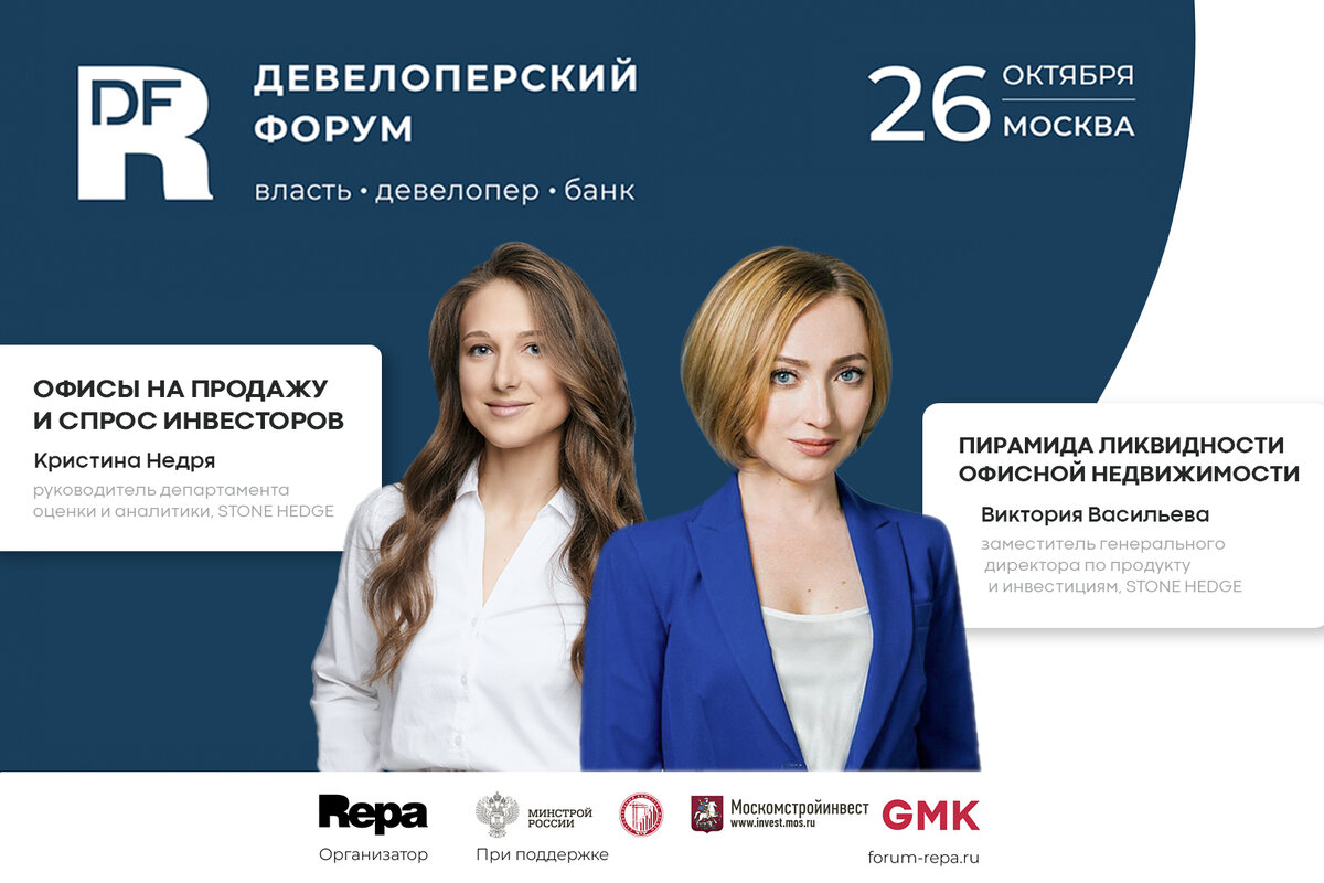 Виктория Васильева, заместитель генерального директора по продукту и инвестициям STONE HEDGE, и Кристина Недря руководитель департамента оценки и аналитики компании, приняли участие в Девелоперском форуме REPA и выступили на сессии по коммерческой недвижимости «Как действовать в новых условиях рынка?», где рассказали о ликвидности офисов, актуальных концепциях и динамике инвестиционного спроса. Девелоперский форум ассоциации REPA – это площадка для объединения и коллаборации всех игроков рынка недвижимости. В форуме принимают участие представители власти и банковских структур, руководители девелоперских и строительных компаний, собственники жилой недвижимости со всей России, а также стран СНГ. Виктория Васильева рассказала участникам сессии о пирамиде ликвидности офисной недвижимости. Основной акцент эксперт сделала на актуальных концепциях для формирования современной офисной среды и познакомила участников форума с концепциями, используемыми в проектах бренда STONE. Так, принцип Healt