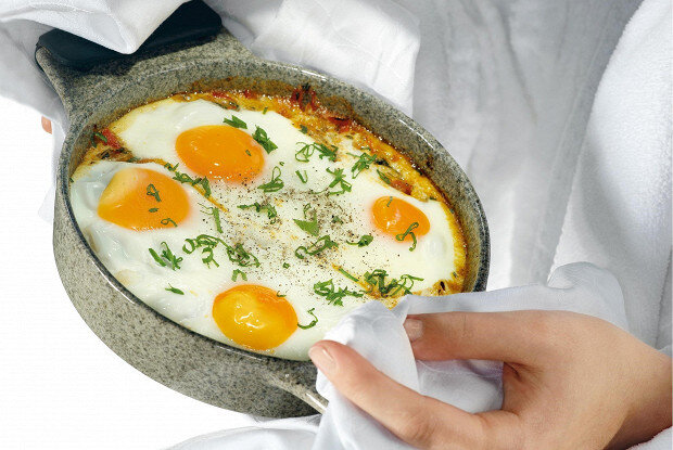 Плотная калорийная яичница, для которой травы и специи сначала надо будет тушить в оливковом масле, а после залить куриным бульоном. После того как яйца смешаются с овощами, блюдо отправляется в духовку. ИНГРЕДИЕНТЫ ПОРЦИИ 2 Куриное яйцо 4 штуки Помидоры 1 штука Репчатый лук ½ головки Красный сладкий перец 1 штука Чеснок 2 зубчика Тимьян 1 стебель Карри щепотка Молотый кумин (зира) щепотка Сахар щепотка Куриный бульон 150 мл Кинза 1 пучок Молотый черный перец по вкусу Соль по вкусу Зеленый лук 1 стебель 1.Помидор нарезать мелкими кубиками, перец — небольшими дольками, пол-луковицы — тонкими полукольцами. Чеснок сначала раздавить плоской стороной ножа, а потом мелко нарезать. 2.Разогреть сковороду и на оливковом масле обжарить лук и перец с тимьяном и щепоткой соли. Затем добавить карри, кумин, помидоры, сахар и все перемешать. 3.Влить в сковороду половник бульона и на сильном огне довести до кипения. Затем уменьшить огонь до среднего и выпарить всю жидкость, не дав подгореть овощам.