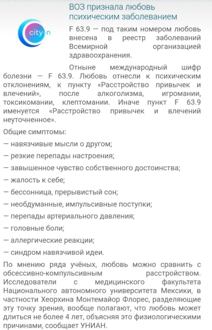ВОЗ признала любовь психическим заболеванием) Что дальше? Новость не новая.