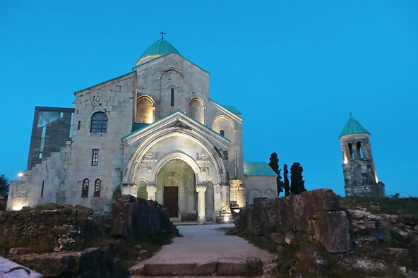 Собор Баграта (Храм Успения Пресвятой Богородицы) - один из самых больших и один из важнейших храмов Грузии. Так как стоит он на высоком холме, его видно отовсюду. Строительство храма начато в X веке, а окончено в 1003 году - в эпоху Золотого века Грузии. Основатель храма - царь Баграт III. В 1089 году здесь был коронован Давид Строитель. Храм простоял более 500 лет. "В 1691 году Кутаиси дважды был взят турками и вроде бы во второй раз храм серьезно пострадал - считается, что от взрыва пороха, который в нем складировали турки. Рухнул купол и крыша. 6 августа 1770 года Кутаиси был взят войсками российского генерала Тоттлебена, и при этом вроде бы храм пострадал еще раз. До сих пор не вполне ясно, кто несет основную ответственность за разрушение - не то ахалцихский паша, не то Тотлебен, не то оба" (http://travelgeorgia.ru/338).