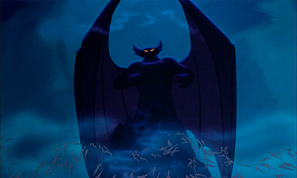 Чернобог властвует над демонами, гарпиями и призраками, которых он заставляет танцевать для своей забавы, прежде чем бросить их в горящее сердце горы. Все в нем – демонстрация власти и контроля: его громадный каркас, широкие крылья и безжалостная улыбка, прекрасно переданная мастером-аниматором Биллом Тайтлой. Чернобог появлялся во многих диснеевских спин-оффах и играх, в том числе в качестве босса во франшизе Kingdom Hearts.