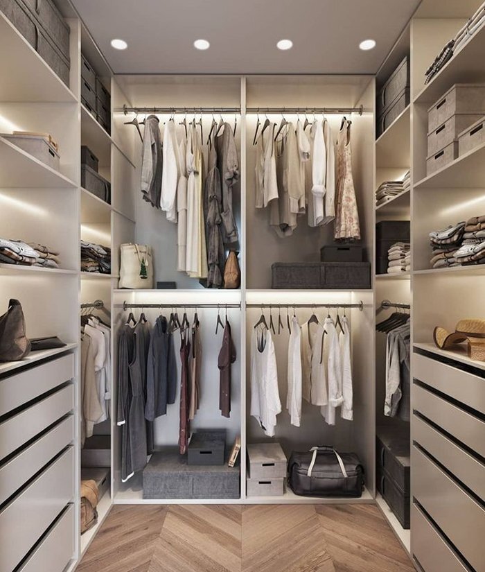 Одним из компактных и удобных способов размещения гардеробной в рамках свободного или ограниченного пространства является организация П-образной гардеробной. Подобная планировка способна решить сразу две проблемы: Основные особенности П-образной гардеробной: o конструкция системы предполагает наличие трех глухих плоскостей, благодаря чему возникает возможность размещения большого количества ящиков, полок, штанг для хранения одежды и прочих полезных приспособлений; o каждую отдельную стену возможно выделить под конкретные цели или под разных членов семьи, что обеспечит максимально быстрый и доступный поиск необходимой вещи; o в таком помещении гораздо проще разместить вертикальное зеркало в полный рост, а также организовать выгодную систему освещения и вентиляции. П-образная гардеробная считается одной из самых практичных и функциональных, она предполагает возможность размещения ящиков и полок как закрытого, так и открытого типа. Создать удобную п-образную конструкцию