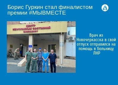 Главный врач новочеркасской БСМП, хирург травматолог-ортопед, майор медицинской службы в запасе, депутат городской Думы Новочеркасска 7 созыва Борис Гуркин стал финалистом премии #МЫВМЕСТЕ в номинации среди добровольцев и волонтёров от Ростовской области.