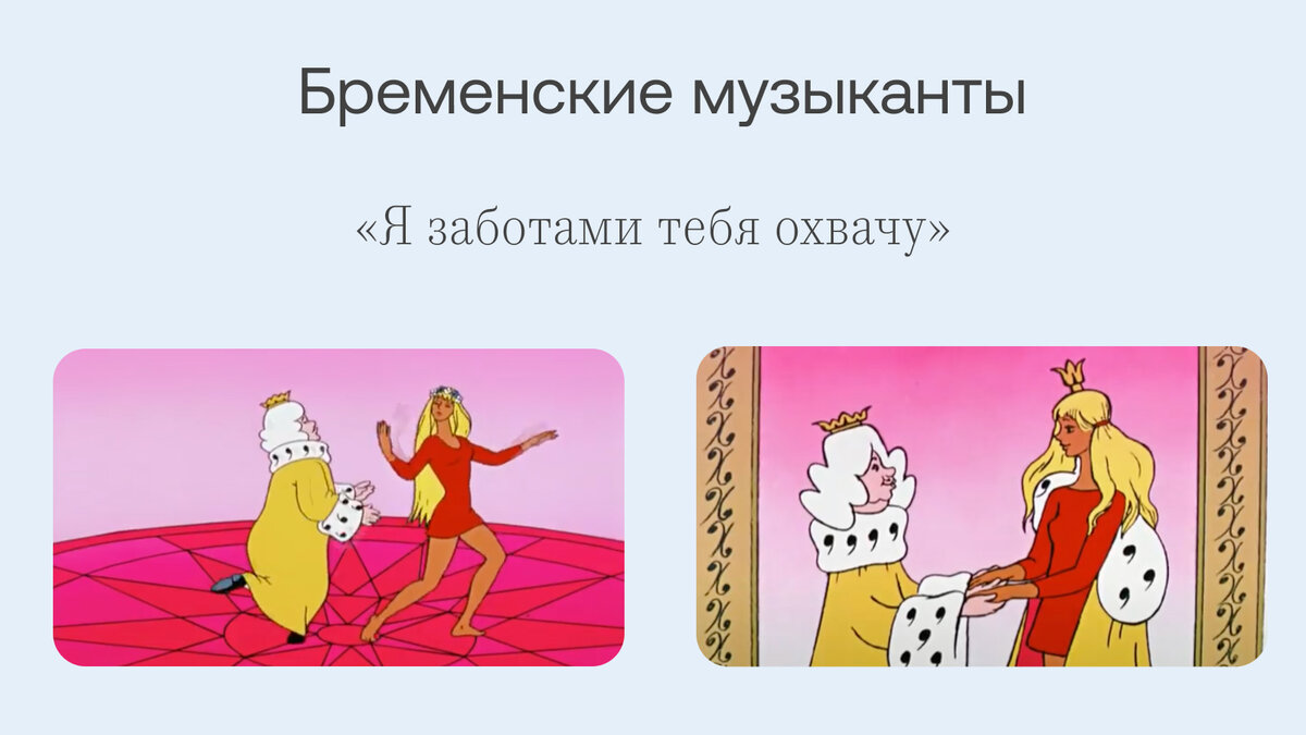 Каждому человеку нужна семья, но что значит «быть семьей»? Мы изучили, что на этот счет говорится в наших любимых мультфильмах ❤️ Бременские музыканты Мы семья, потому что мы заботимся друг о друге, особенно, когда случаются трудные дни. Если кто-то грустит, мы сразу стараемся охватить человека заботами: вкусно накормить или послушать вместе любимую музыку. Падал прошлогодний снег Мы семья, ведь мы радуем друг друга подарками: маленькими и большими. Мы даже готовы отправиться в лес за елочкой, если будет нужно. Только, кажется, подарочков всегда маловато. Мама для мамонтенка Мы семья, когда мы долго не видимся, начинаем сильно тосковать друг по другу и искать встречи. Переплыть океан через волны и ветер для нас не проблема, лишь бы увидеть друг друга! Трое из Простоквашино Мы точно семья! Мы обожаем проводить время вместе. Мы можем и в пинг-понг играть, и в шахматы и запорожец собирать. Главное, чтобы все мы были рядом, даже не важно где: в деревне, на море или в нашей квартире. Умка