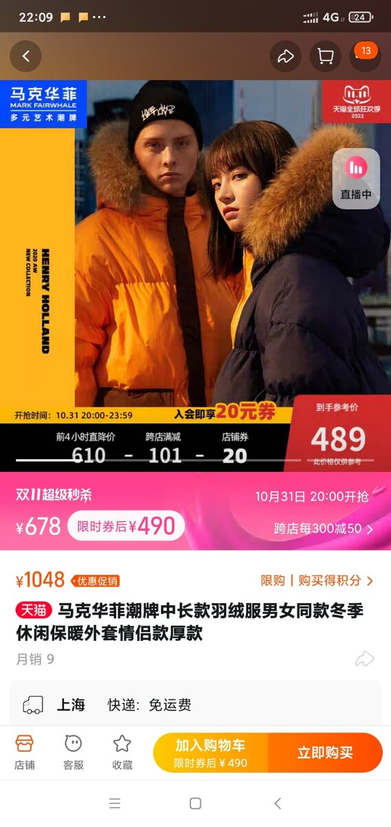 Привет, друзья! На связи Дмитрий. Спешу поделится с вами полезной информацией о правилах проведения акции 11.11 на Taobao и Poizon (Dewu). День шопинга 11 ноября на Таобао и Пойзон весьма похожи, но имеют свои особенности. День шопинга 11.11 на Таобао Пост я пишу 28 октября, в эти дни активно ведутся предпродажи. Приём предоплаты начался в 20:00 часов 24 октября и продлится до 17:59 31 октября. Оплата основных сумм планируется с 20:00 31 октября до 23:59 3 ноября. Смысл авансовых платежей - существенная скидка на товар. Скидка зависит от ценовой политики конкретного магазина. В период с 20:00 31 октября по 23:59 3 ноября проходит акция, по правилам которой за каждые 300 юаней покупатель получает 50 юаней скидки. Покупаете на 600 юаней, то получаете скидку в 100 юаней и так далее. Вторая волна данной акции продолжится с 20:00 10 ноября по 23:59 11 ноября. Расчёт примерно такой, смотрите скриншот ниже. Товар стоит на данный момент 1048 юаней. 31 октября в 20:00 цена снизится до 610 юан