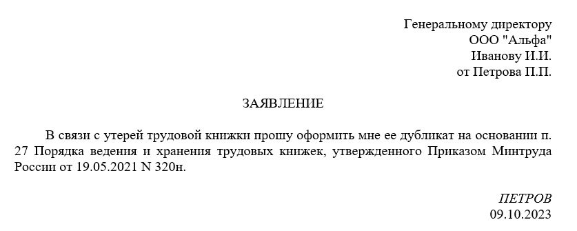 Работник, утерявший трудовую книжку, должен сообщить об этом работодателю, который обязан выдать дубликат в течение 15 рабочих дней на основании заявления от работника. Заявление оформляется в свободной форме. Вы можете ознакомиться с нашим вариантом его заполнения ниже: