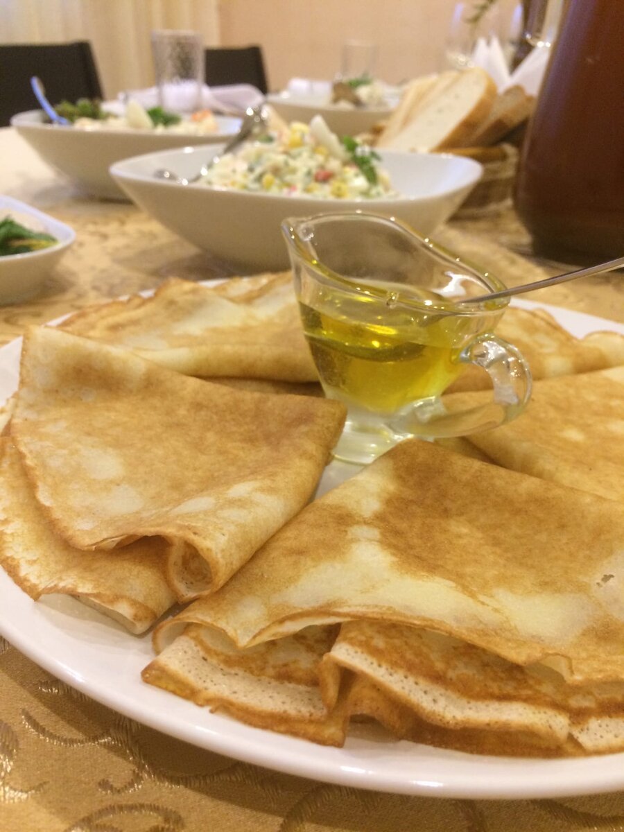 Обязательно должна быть кутья с изюмом, блины с медом, два первых блюда - щи и суп-лапша, тушёная картошка с мясом, пшенная молочная каша и компот. Кроме этого ставят на стол нарезанные квадратиками пироги, заказанные на пекарне, конфеты, фрукты, консервации, селёдку с луком, овощные и колбасные нарезки. Вина или водки выпивают только по три стопки. Долго не засиживаются, потому что поминают в две, а то и в три смены. Одни выходят из-за стола, другие садятся. Человек тридцать пришло поминать папу. Успевали только наливать и накладывать. Пришедшие говорили, какой папа был замечательный человек, сколько добра он сделал людям, сколько детей выучил.