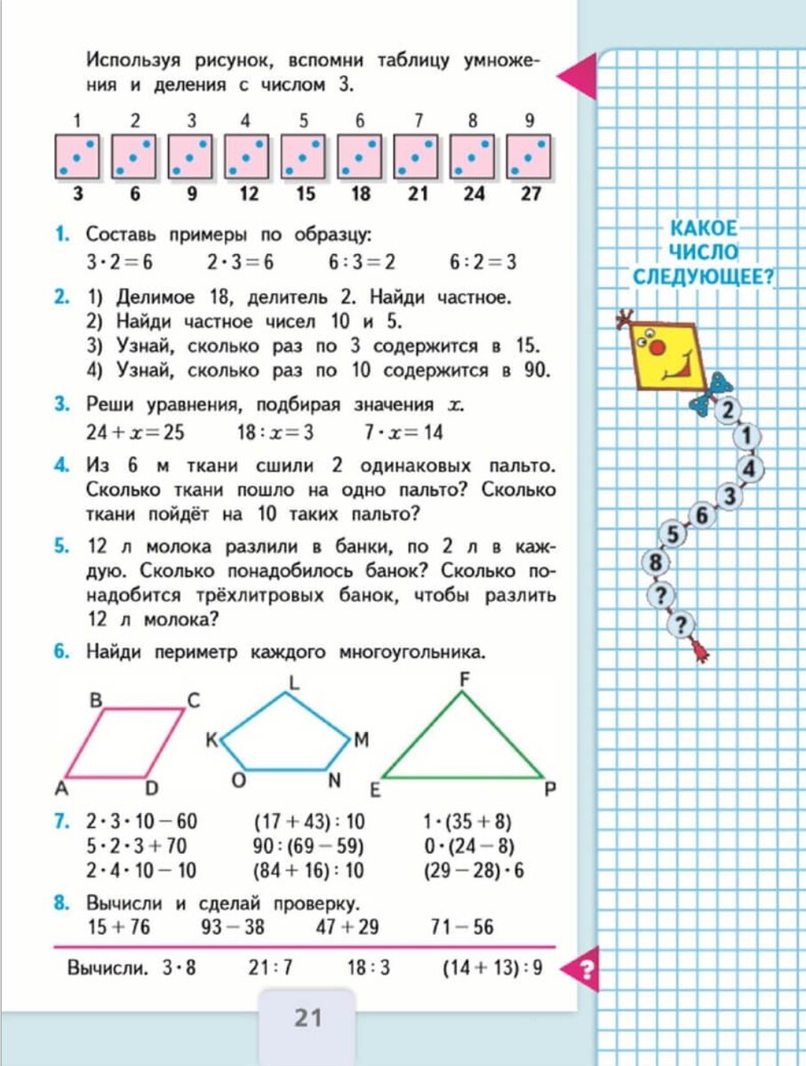 Используя рисунок, вспомни таблицу умножения и деления с числом 3. Ответ: 3 ∙ 1 = 3 3 : 3 = 1 3 ∙ 2 = 6 6 : 3 = 2 3 ∙ 3 = 9 9 : 3 = 3 3 ∙ 4 = 12 12 : 3 = 4 3 ∙ 5 = 15 15 : 3 = 5 3 ∙ 6 = 18 18 : 3 = 6 3 ∙ 7 = 21 21 : 3 = 7 3 ∙ 8 = 24 24 : 3 = 8 3 ∙ 9 = 27 27 : 3 = 9 3 ∙ 10 = 30 30 : 3 = 10 Номер 1. Составь примеры по образцу. Ответ: 7 ∙ 3 = 21 6 ∙ 3 = 18 3 ∙ 7 = 21 3 ∙ 6 = 18 21 : 3 = 7 18 : 3 = 6 21 : 7 = 3 18 : 6 = 3 3 ∙ 4 = 12 3 ∙ 8 = 24 4 ∙ 3 = 12 8 ∙ 3 = 24 12 : 4 = 3 24 : 8 = 3 12 : 3 = 4 24 : 3 = 8 Номер 2. 1) Делимое 18, делитель 2. Найди частное. 2) Найди частное чисел 10 и 5. 3) Узнай, сколько раз по 3 содержится в 15. 4) Узнай, сколько раз по 10 содержится в 90. Ответ: 1) 18 : 2 = 9. 2) 10 : 5 = 2. 3) 15 : 3 = 5. 4) 90