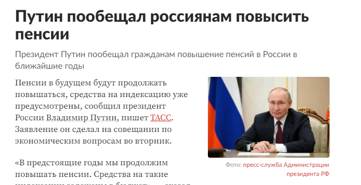 Здравствуйте, уважаемые пенсионеры. У меня ничего не меняется, я к вам как с хорошими, так и не очень новостями. Вчера на государственных СМИ «lenta ру» вышла статья о том, что Путин пообещал россиянам повысить пенсии. Хорошо, сейчас посмотрим насколько пенсионерам будет повышена пенсия, подумал я и приготовился вникать в цифры. Всë происходило на совещании по экономическим вопросам. Президент выступил и сказал, что предусмотрена индексация пенсий — средства на всё это уже найдены. Мы всегда повышали пенсию, всегда заботились о пенсионерах и в этот раз это не будет исключением. Многие другие СМИ раструбили эту информацию, с максимально кричащими заголовками, типа: «Это РЕКОРДНАЯ ИНДЕКСАЦИЯ ПЕНСИЙ», или «ТАКОГО ПОВЫШЕНИЯ ПЕНСИЙ РОССИЯ ЕЩЁ НЕ ВИДЕЛА». Конечно же, читая такие статейки, приходит понимание, что нас где-то обманывают. Но вернёмся к президенту. Так как средства уже заложены в бюджет, президент пообещал что в 2023 году будет очень сильно повышать индексацию, внимание... Вы д