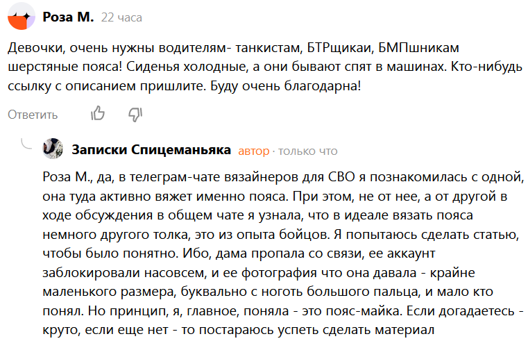 Я писала уже про вязаные пояса со своим улучшайзингом: А тут комментарий: Я и забыла про тот момент от навала других событий и не написала статью сразу... Так что огроменное спасибо за комментарий-пендель, польза будет для наших же! И мне урок - надо было записать! Так что спрашивайте, мало ли что-то проскакивало полезное, а я пропустила мимо сознания и все спрятано в подсознании. Так вот, она (дама, у которой аккаунт видимо взломали или чего похуже не случилось) писала, что парням, по их буквально выбитым отзывам ("не хотели нас расстраивать"), обычные пояса в тех условиях неудобны - съезжают и коротки. Они же там не статично работают... Хоть какие пояса делай, хоть "мои" про которые в начале статьи. Даже вариантом "радикулитного жилета" из-за недостатка - застежки. Она и сказала - вяжите пояса-майки, до конца попца, и крошечное фото, причем темный пояс на темном фоне)) Сейчас уже не найду: на чат "нападали" вороги, его отстояли, но многое из медиафайлов там исчезло. У другого - тоже