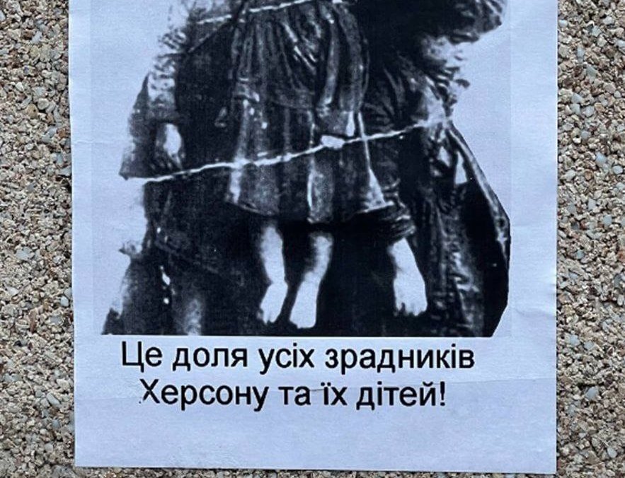 По Сети гуляют фото листовок с угрозами в адрес «всех предателей Херсона и их детей», подкрепленных для наглядности фотографией повешенных детей. Комментаторы возмущаются – вот она, звериная сущность бандеровщины, во всей красе.