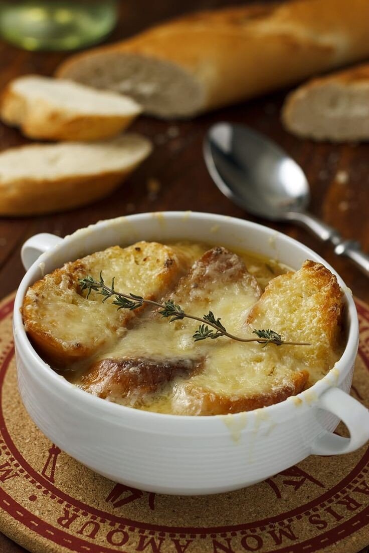 Ингредиенты: Лук репчатый — 1 кг Масло сливочное — 50 гр Мука — 1 ст.л. (20 гр) Вода — 100 мл Бульон (говяжий, куриный или овощной) — 2 л Сухое белое вино — 100 мл Лавровый лист — 1 шт. Тимьян (свежий или сухой) — 2 веточки Соль, перец Для подачи: Багет или другой белый хлеб Твёрдый сыр (грюйер или пармезан) — 150 гр ________________________ Сразу начнём с самого сложного в этом рецепте. Возьмём кило репчатого лука, почистим его и порежем полукольцами. Плачем, рыдаем, но не останавливаемся! Можете попробовать один из способов, описанных в начале. А если серьёзно, просто возьмите очень острый нож, периодически смачивайте его водой и режьте быстрее. Фишка со свечой тоже иногда помогает. Когда дело будет сделано, разогреваем подходящую посуду, лучше всего эмалированный казанчик или утятницу или хорошую сковороду, сотейник или кастрюлю с толстым дном. Растапливаем сливочное масло и закидываем лук. Тушить мы его будем достаточно долго на медленном огне, поэтому важно, чтобы посуда прогр
