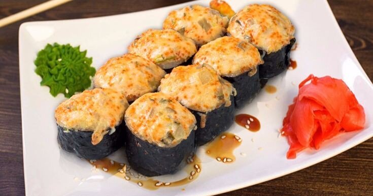 Тебе понадобится: 250 г риса, 370 мл воды, 30 мл рисового уксуса, 0,5 ч.л. соли, 0,5 ч.л. сахара, нори, 2 ч.л. икры мойвы, острый соус, огурец, сыр Филадельфия, креветки. Приготовление: 1. Промой рис несколько раз, чтобы вода стала прозрачной. Отвари его в воде до кипения, и потом – еще 10-12 минут на минимальном огне под крышкой. Смешай уксус, соль и сахар, и смешай с рисом через 10 минут. 2. Нарежь огурец тонкими полосочками без серединки. Отрежь по 2/3 листа нори. 3. Измельчи 7 креветок, смешай их с 2-3 ч.л. филадельфии, икрой мойвы и острым соусом. 4. Выложи рис на нори, не доходя 2 см до края. Потом – филадельфию, огурец, креветки, и скрути ролл. Нарежь его ножом на кусочки, выложи сверху горку соуса, сложи на пергамент и отправь на 5 минут в духовку при 200 градусах.
