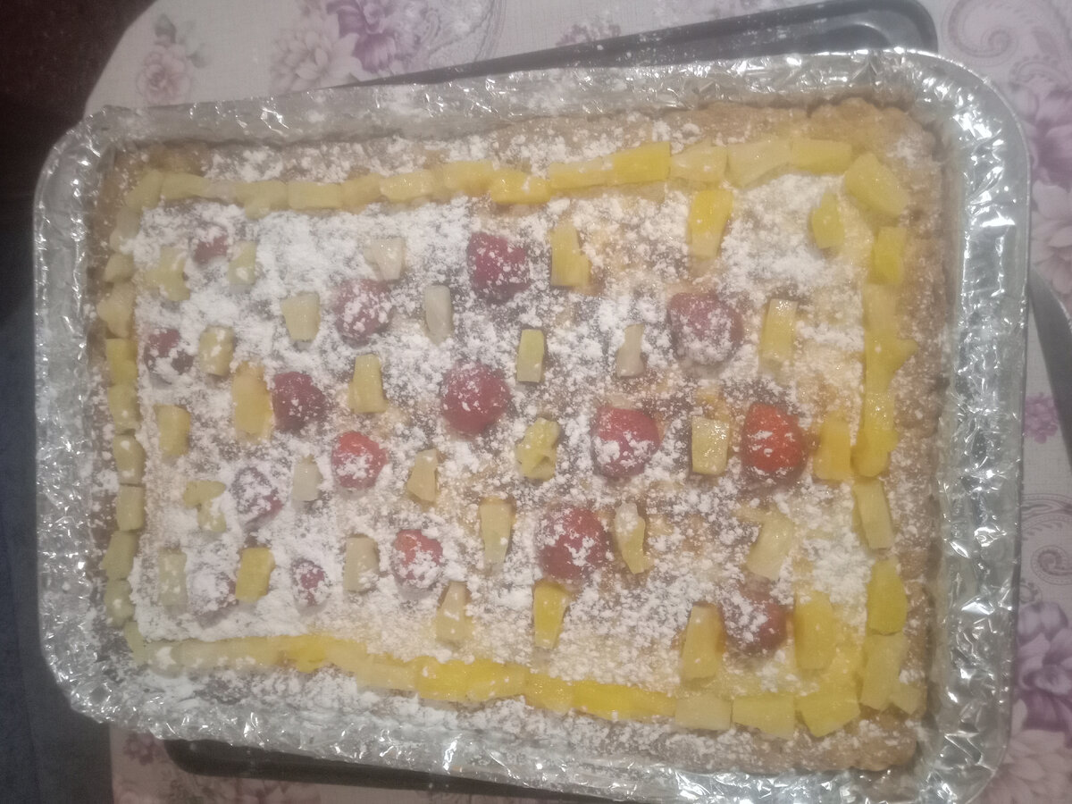 Масло 500 гр. нарезать кусочками И всыпать 2 стакана сахара. Добавить 2 яйца 600 гр. муки Ванилин 4 гр. Замесить тесто руками Выложить на противень, сделать бортики Выложить натертые яблоки Далее делаем крем: 800 гр. метаны и 10 яиц Добавить стакан сахара Взбить миксером, до однородной массы Залить наш пирог Выпекать 45-50 минут при 180 градусах Если он будет слегка жидковат, ничего страшного, после остывания пирог застынет. Украсить можно по желанию, я украсила клубникой и ананасом Сверху посыпать сахарной пудрой. Всем добра.