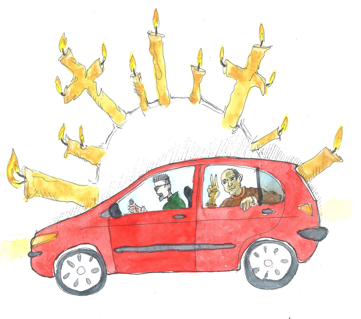 Две огромные длинные руки схватили машину спереди и сзади. Меня уже и так трясло, самого по себе, а тут ещё это— но кое-как я достал из машины флягу со святой водой. Саша и Рома помогали как могли: один открыл окно, а другой выпихнул меня наружу, держа за ремень штанов. Друзья, называется!